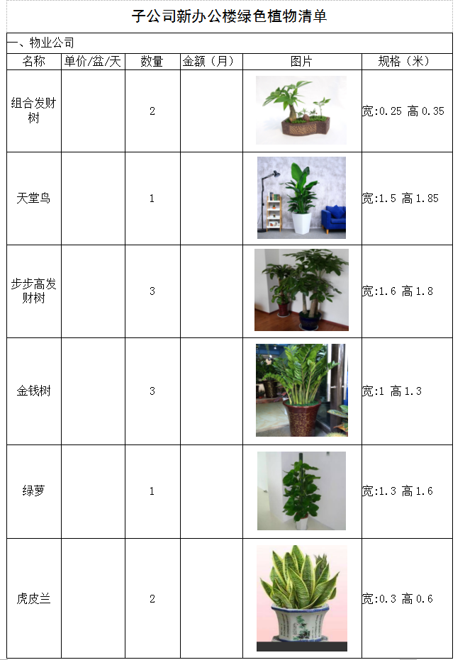 城投公司下屬子公司新辦公樓綠色植物租賃詢價函