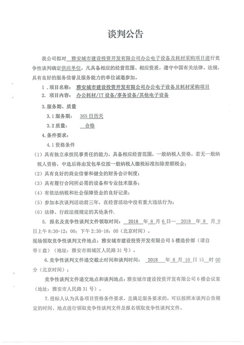 雅安城市建設投資開發(fā)有限公司辦公電子設備及耗材采購項目——競爭性談判公告