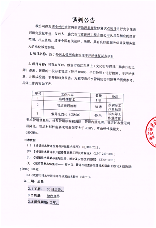 四小外污水管網(wǎng)病害治理非開挖修復(fù)試點項目競爭性談判公告(市政公司)