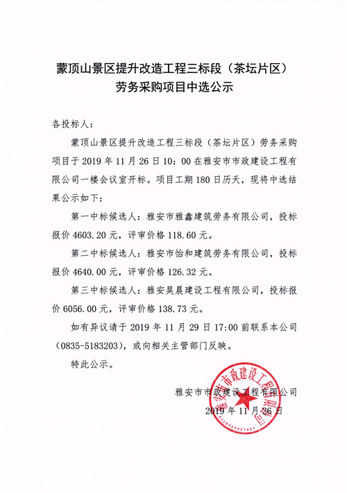 蒙頂山景區(qū)提升改造工程三標(biāo)段(茶壇片區(qū))勞務(wù)采購(gòu)項(xiàng)目招標(biāo)中選公示