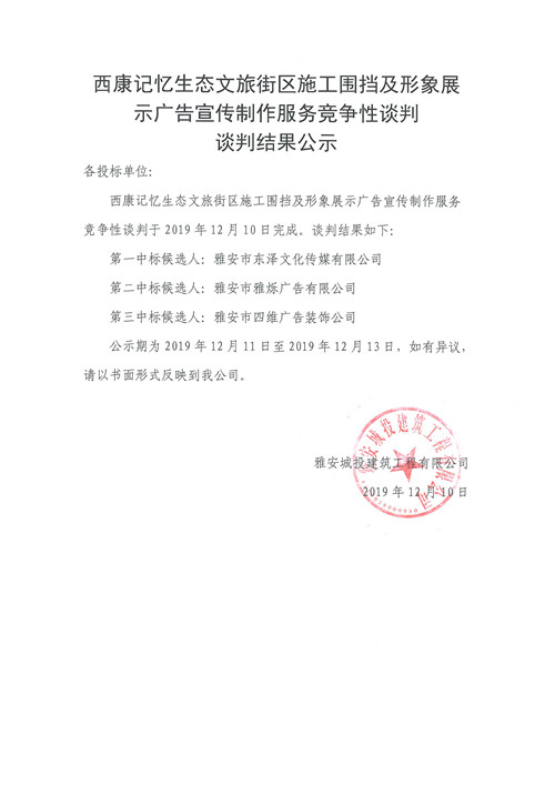 西康記憶生態(tài)文旅街區(qū)施工圍擋及形象展示廣告宣傳制作服務(wù)競(jìng)爭(zhēng)性談判談判結(jié)果公示