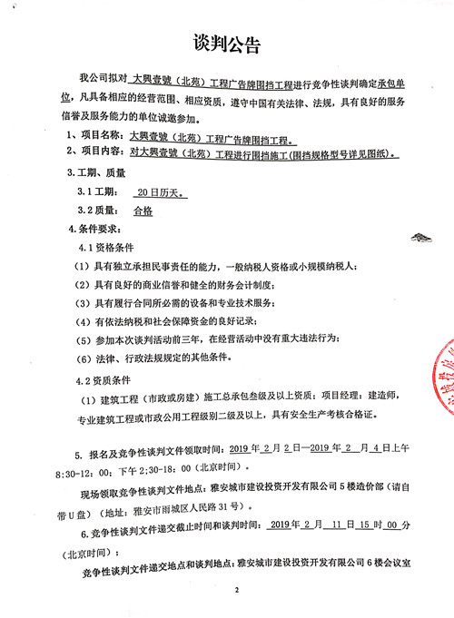 大興壹號(北苑)工程廣告牌圍擋工程競爭性談判公告