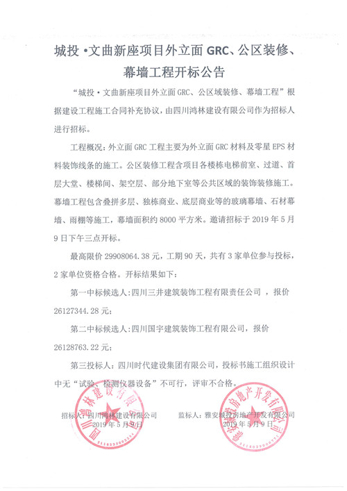 城投·文曲新座項目外立面GRC、公區(qū)裝修、幕墻工程開標(biāo)公告