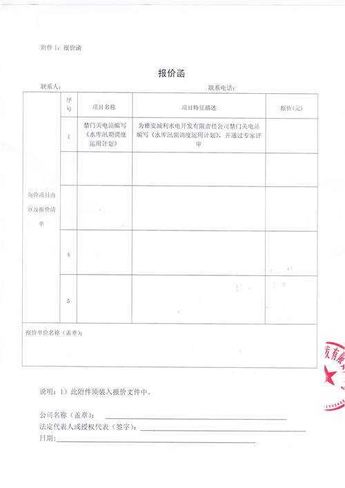 詢價函(《水庫汛期調(diào)度運用計劃》)