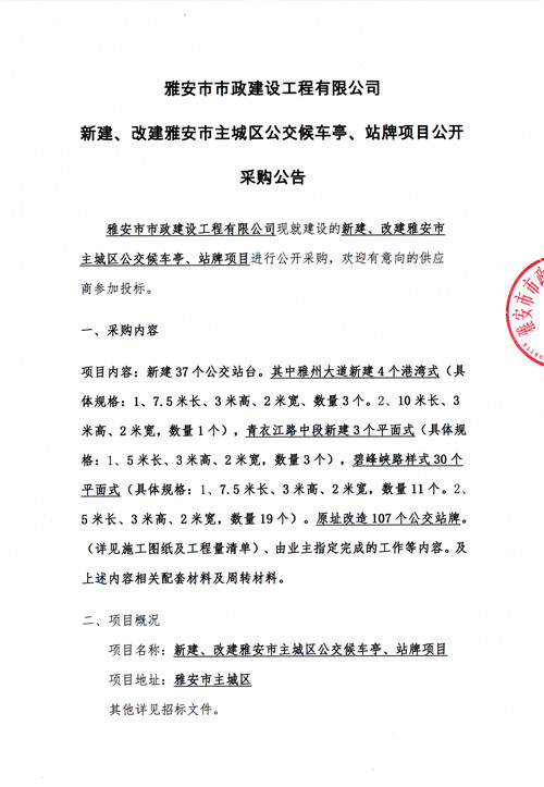 新建、改建雅安市主城區(qū)公交候車亭、站牌項目公開采購公告