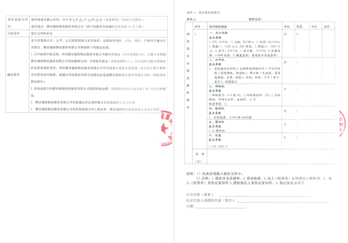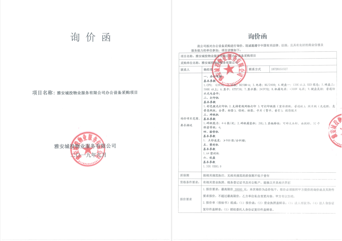 雅安城投物業(yè)詢價(jià)函(辦公設(shè)備)