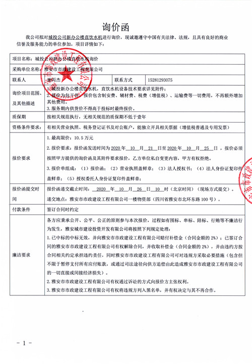 城投公司新辦公樓直飲水機(jī)詢價(jià)函