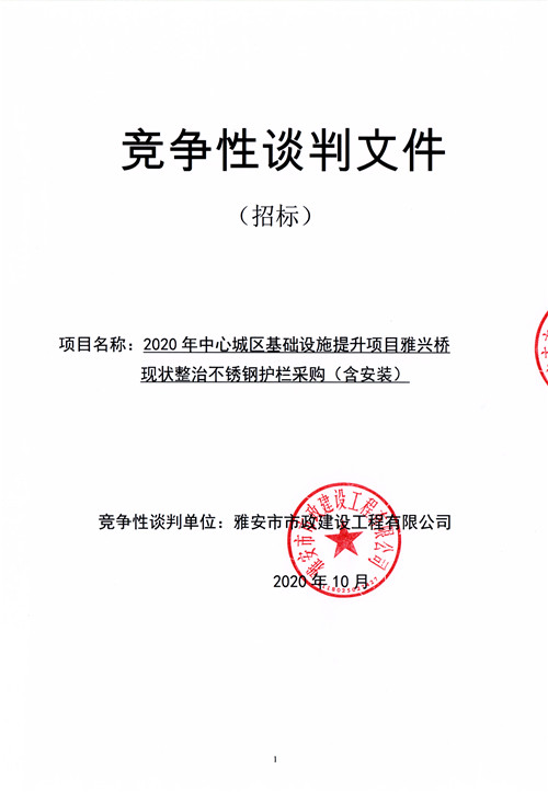 市政公司2020年中心城區(qū)基礎(chǔ)設(shè)施提升項目雅興橋現(xiàn)狀整治不銹鋼護欄采購(含安裝)競爭性談判公告