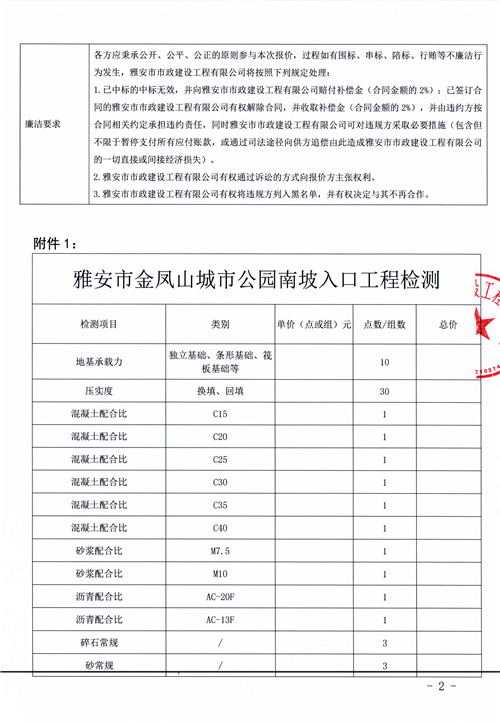 雅安市金鳳山城市公園南坡入口工程檢測服務(wù)詢價(jià)函