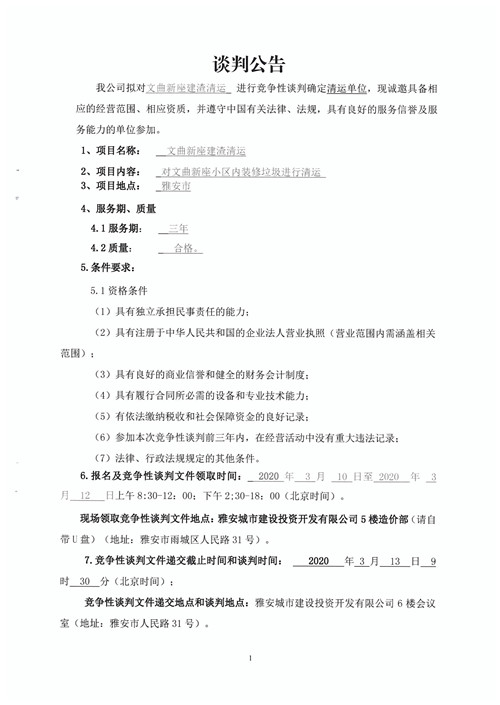 物業(yè)公司文曲新座建渣清運確定清運單位的競爭性談判公告