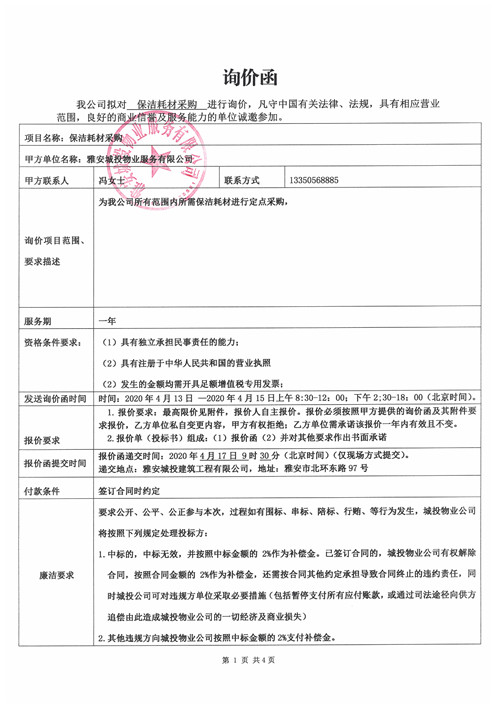 保潔耗材采購(gòu)詢(xún)價(jià)函