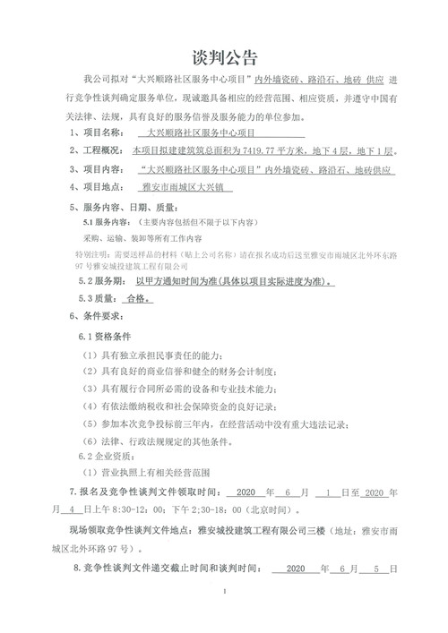 城投建工公司“大興順路社區(qū)服務(wù)中心項(xiàng)目”內(nèi)外墻瓷磚、路沿石、地磚供應(yīng)競爭性談判公告