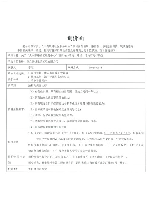 城投建工“大興順路社區(qū)服務(wù)中心”項(xiàng)目?jī)?nèi)外墻磚、路沿石、地磚詢價(jià)函