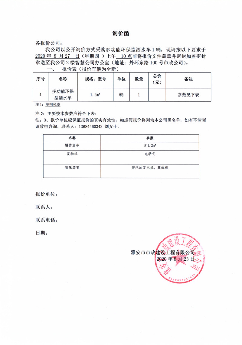 雅安市市政建設(shè)工程有限公司采購多功能環(huán)保型灑水車詢價函