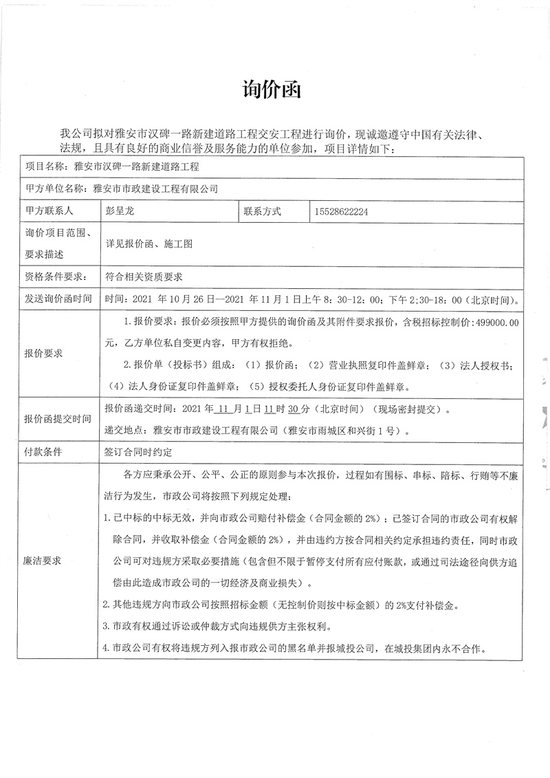 雅安市漢碑一路新建道路工程交安工程詢價(jià)函