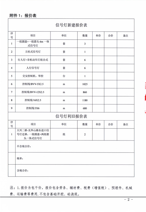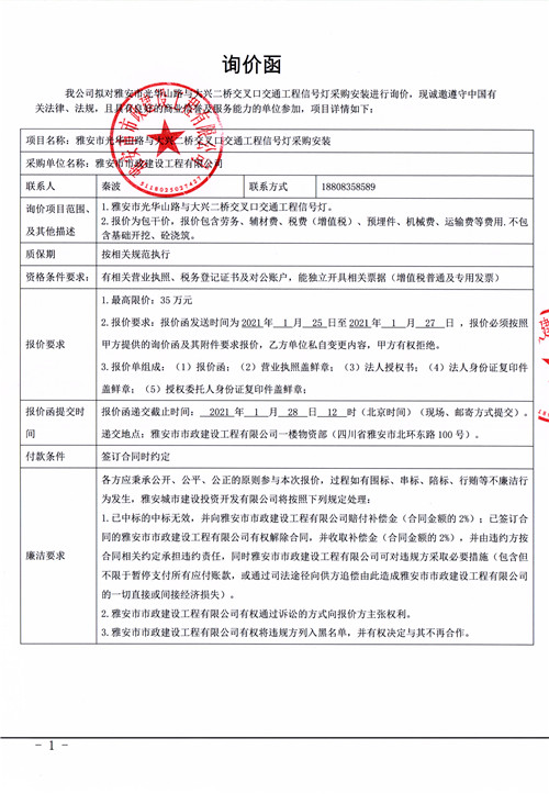 雅安市市政建設(shè)工程有限公司雅安市光華山路與大興二橋交叉口交通工程信號(hào)燈采購(gòu)安裝詢價(jià)函
