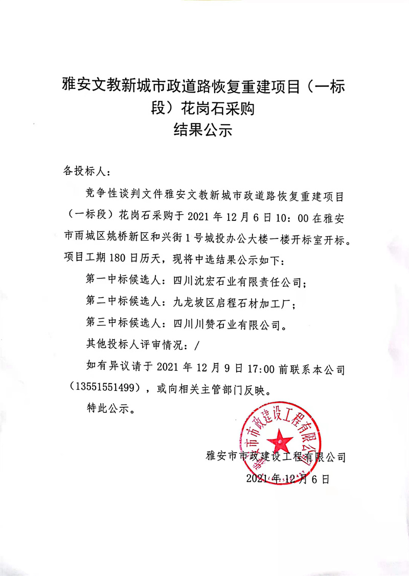 雅安文教新城市政道路恢復重建項目(一標段)花崗石采購結(jié)果公示