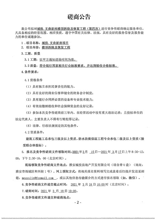 城投地產(chǎn)公司文曲新座樓頂拆除及恢復工程(第四次)競爭性磋商公告