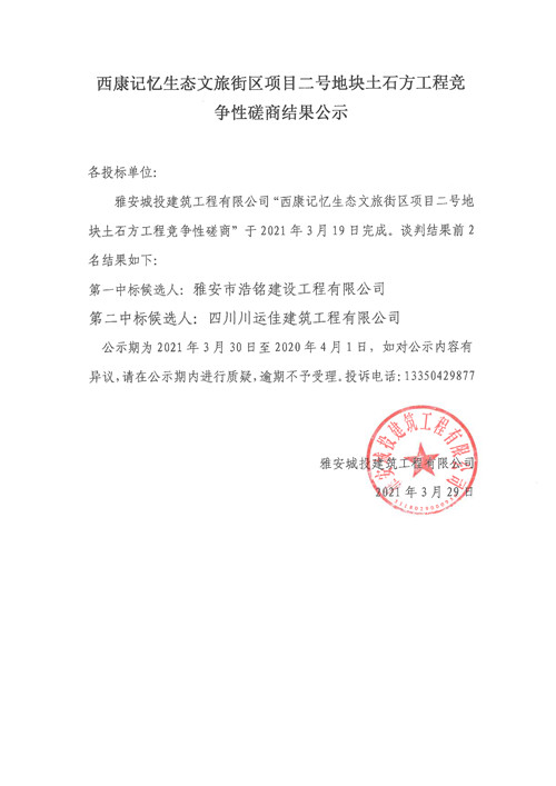 城投建工公司雅安市西康記憶生態(tài)文旅街區(qū)項(xiàng)目二號地塊土石方工程競爭性磋商結(jié)果公示