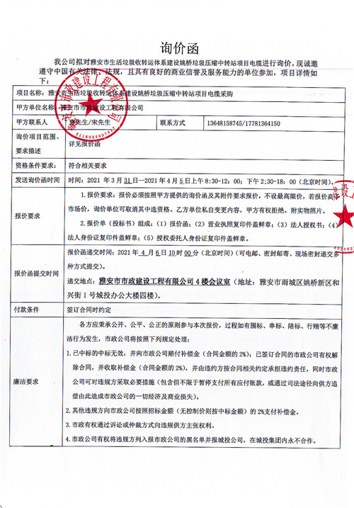 雅安市生活垃圾收轉(zhuǎn)運(yùn)體系建設(shè)姚橋垃圾壓縮中轉(zhuǎn)站項(xiàng)目電纜采購(gòu)詢價(jià)函