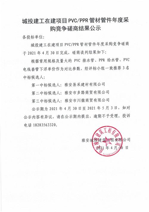 城投建工在建項(xiàng)目PVC/PPR管材年度采購磋商結(jié)果公示