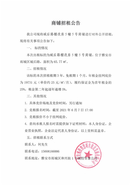 城投智慧公司城后路棚改房房5幢5號商鋪招租公告