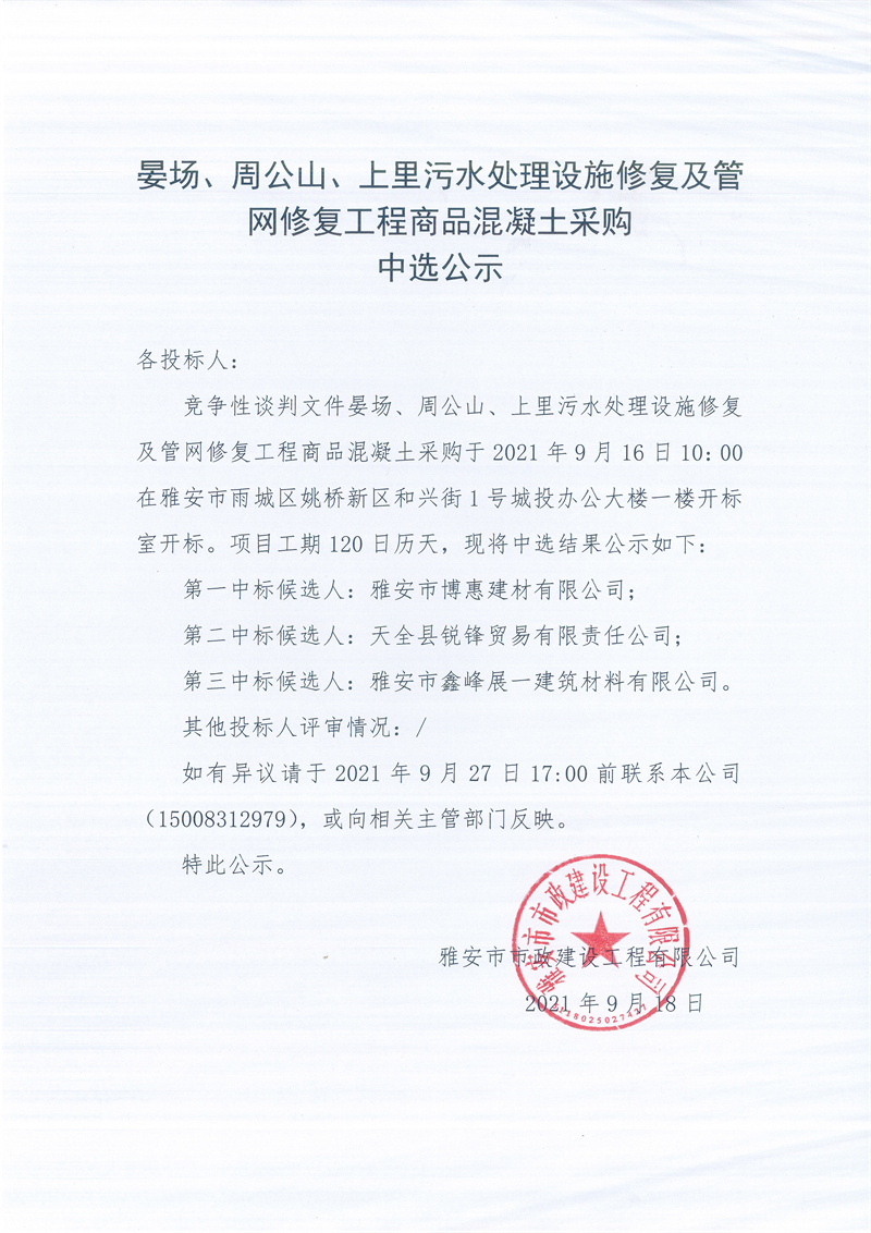 晏場、周公山、上里污水處理設施修復及管網(wǎng)修復工程商品混凝土采購競爭性談判結果公示