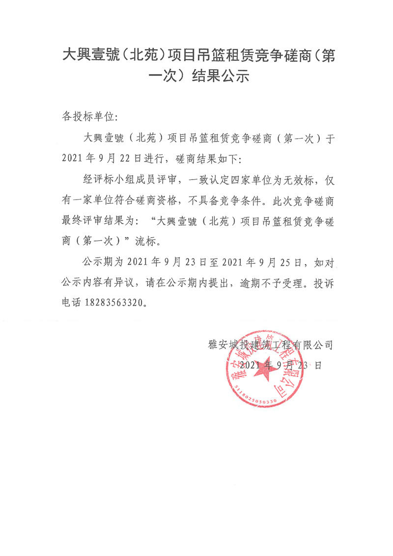 大興壹號(北苑)項(xiàng)目吊籃租賃競爭性磋商(第一次)結(jié)果公示