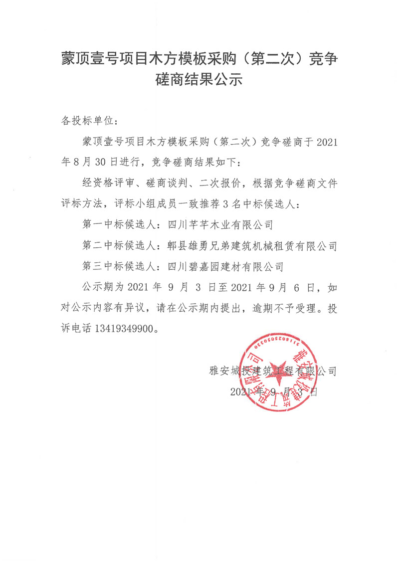 城投建工公司蒙頂壹號項目木方模板采購(第二次)競爭磋商結(jié)果公示