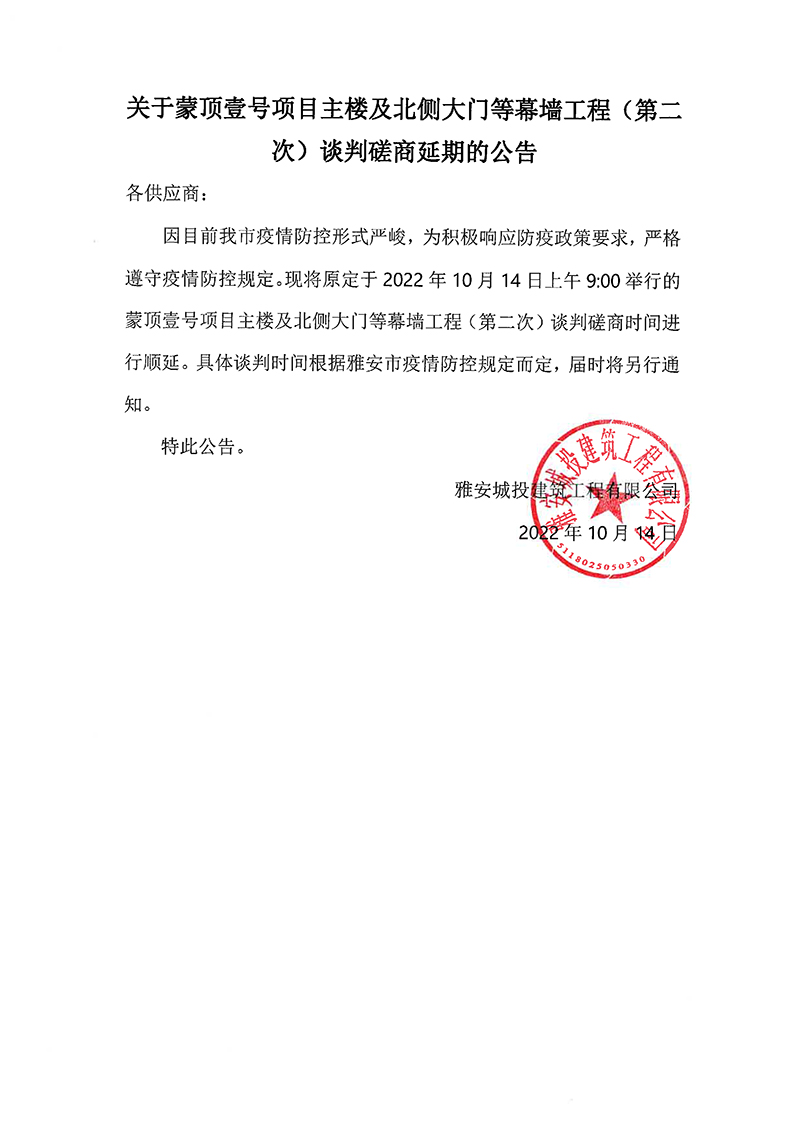 蒙頂壹號(hào)項(xiàng)目主樓及北側(cè)大門等幕墻工程(第二次)談判磋商延期的公告