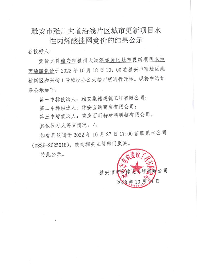 雅安市雅州大道沿線片區(qū)城市更新項(xiàng)目水性丙烯酸掛網(wǎng)競價(jià)的結(jié)果公示