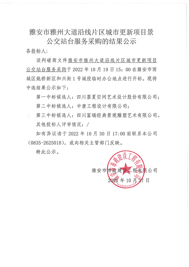 雅安市雅州大道沿線片區(qū)城市更新項(xiàng)目景觀公交站臺(tái)服務(wù)采購(gòu)的結(jié)果公示