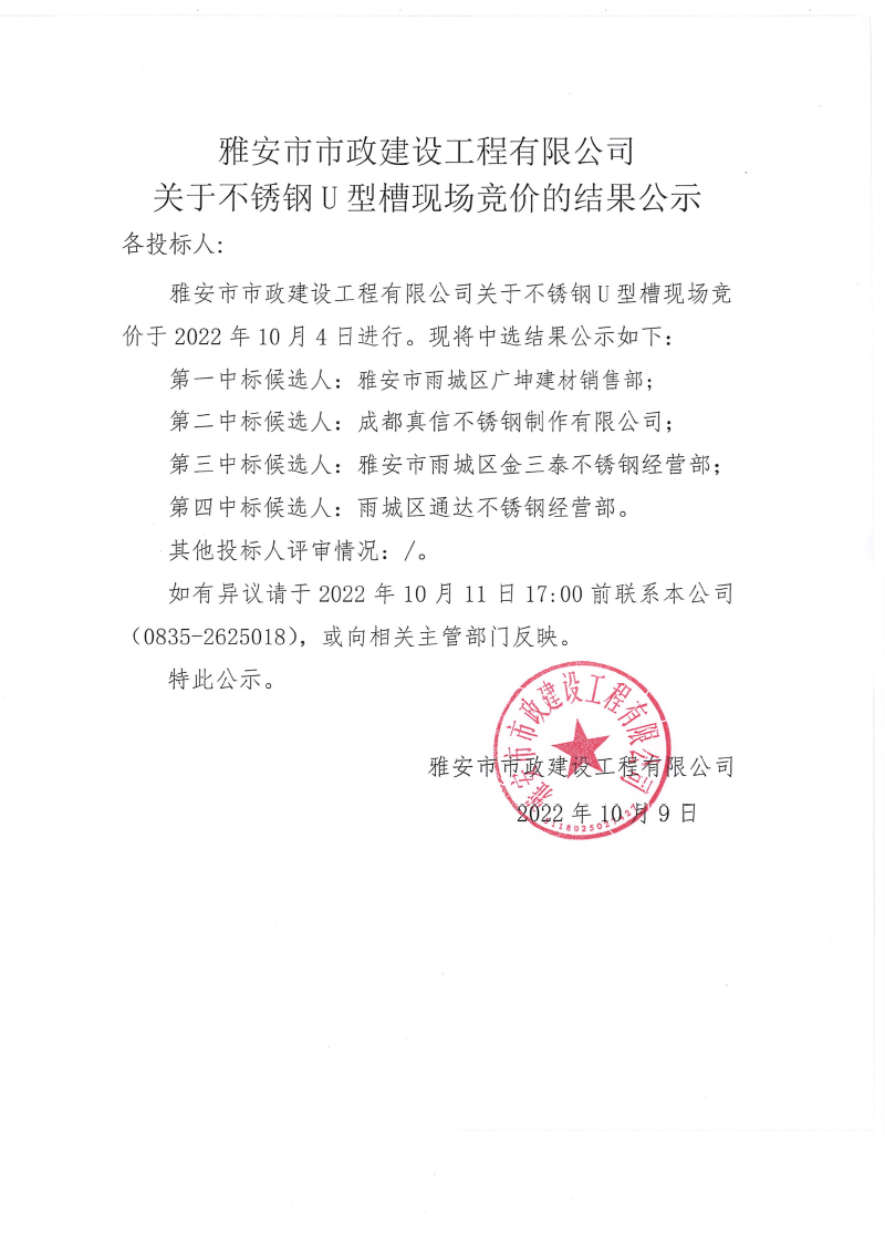 關(guān)于不銹鋼U型槽進(jìn)行現(xiàn)場競價(jià)的結(jié)果公示