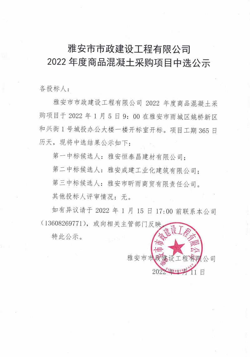 雅安市市政建設(shè)工程有限公司2022年度商品混凝土采購項(xiàng)目中選公示