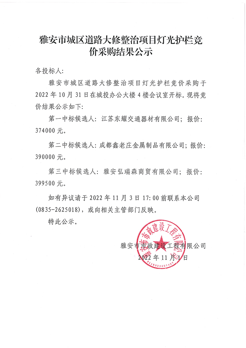 雅安市城區(qū)道路大修整治項目燈光護欄采購競價結(jié)果公告