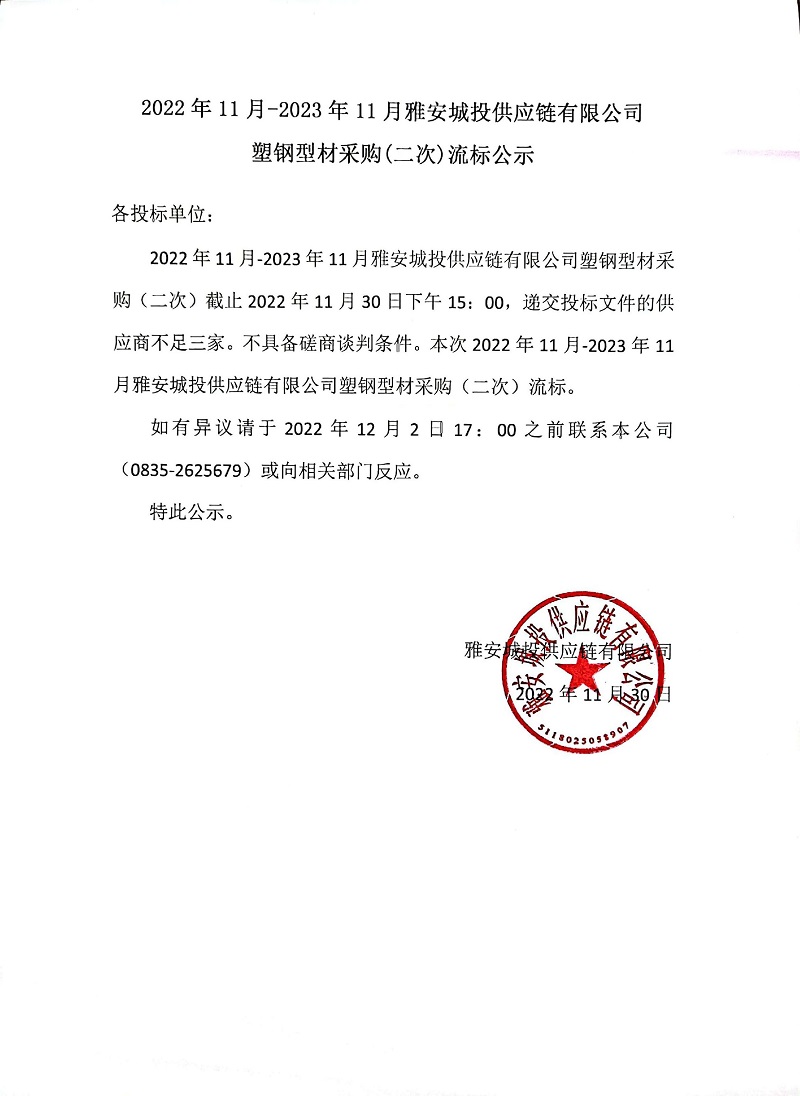 2022年11月-2023年11月雅安城投供應(yīng)鏈有限公司塑鋼型材采購(二次)流標公示