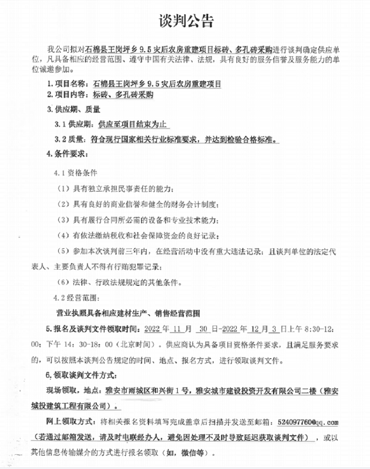 石棉縣王崗坪鄉(xiāng)9.5災(zāi)后農(nóng)房重建項目標(biāo)磚、多孔磚采購談判公告