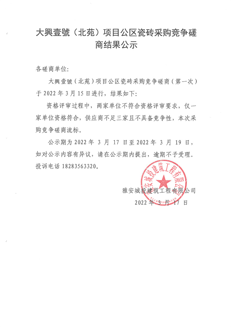 城投建工公司大興壹號(hào)(北苑)項(xiàng)目公區(qū)瓷磚采購(gòu)競(jìng)爭(zhēng)磋商結(jié)果公示