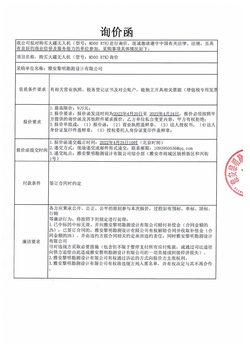 黎明勘測公司購買大疆無人機(jī)(型號:M300 RTK)詢價函