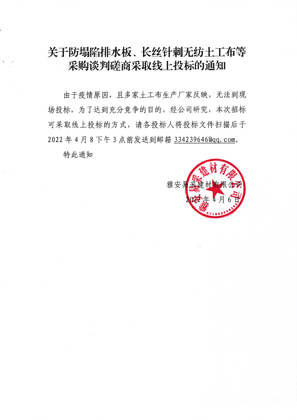雅安易采建材有限公司防塌陷排水板、長(zhǎng)絲針刺無紡?fù)凉げ嫉炔少?gòu)談判磋商采取線上投標(biāo)的通知