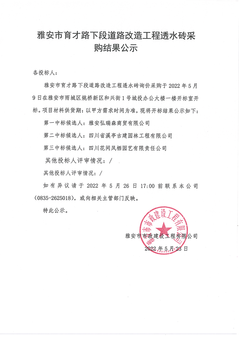 雅安市育才路下段道路改造工程透水磚采購結(jié)果公示