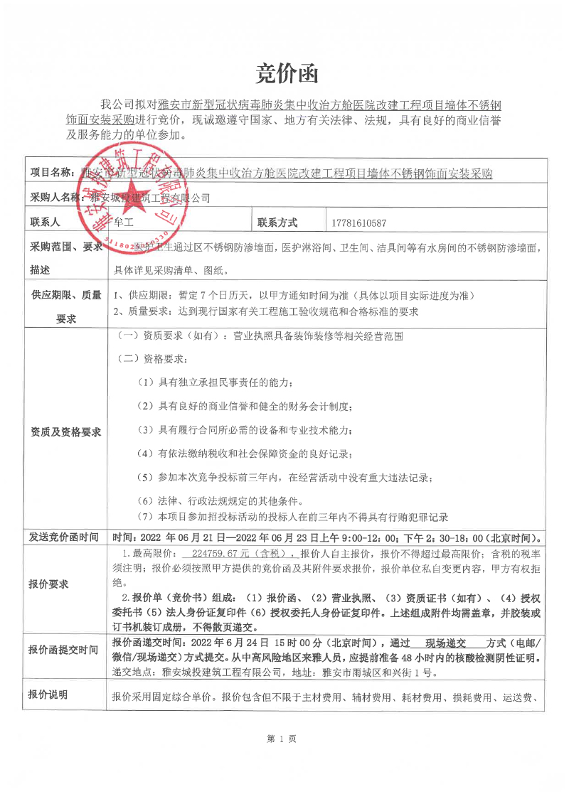 雅安市新型冠狀病毒肺炎集中收治方艙醫(yī)院改建工程項(xiàng)目墻體不銹鋼飾面安裝采購競價(jià)公告