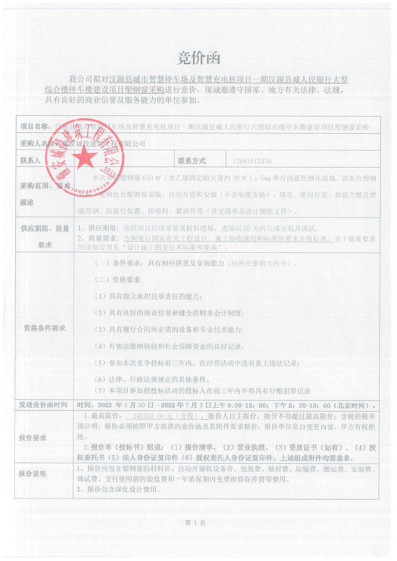 漢源縣城市智慧停車場及智慧充電樁項目一期漢源縣城人民銀行大型綜合樓停車樓建設項目塑鋼窗采購競價公告