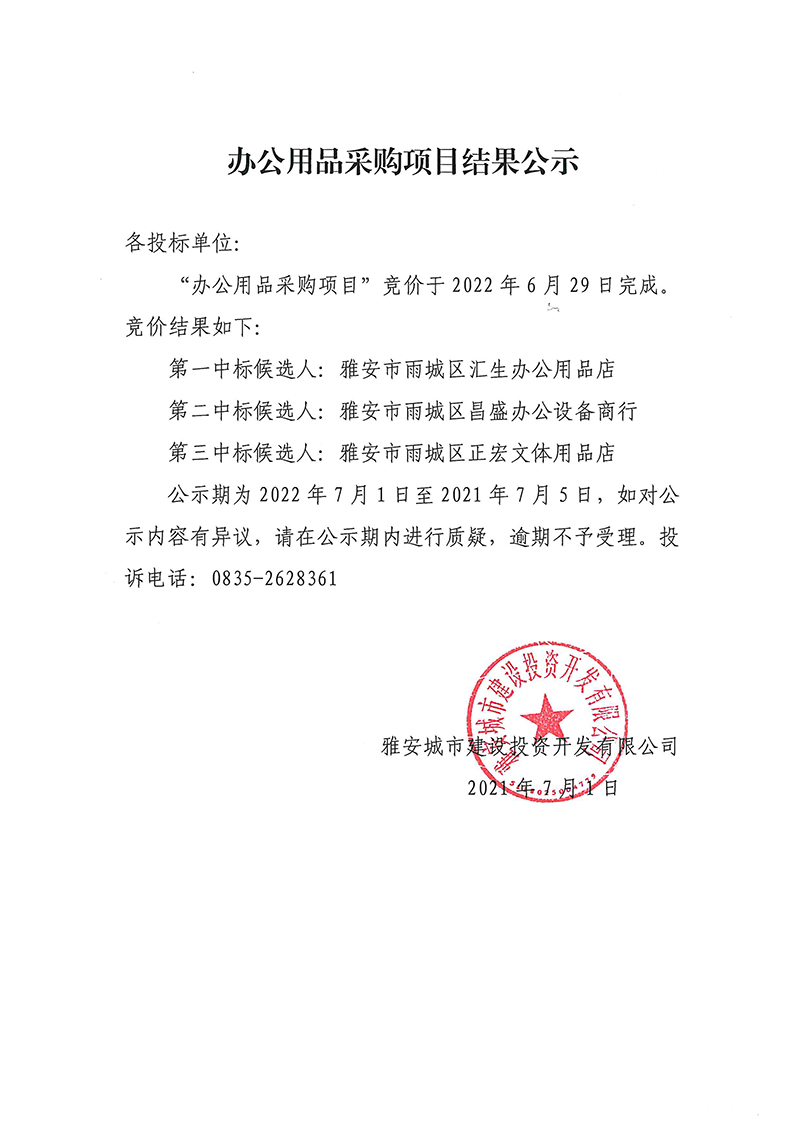 雅安城市建設(shè)投資開發(fā)有限公司辦公用品采購項目競價結(jié)果公示