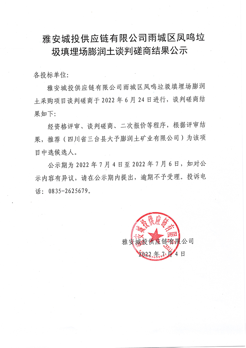 雅安城投供應(yīng)鏈有限公司雨城區(qū)鳳鳴垃圾填埋場封場永久性治理工程項目鈉基膨潤土談判磋商結(jié)果公示