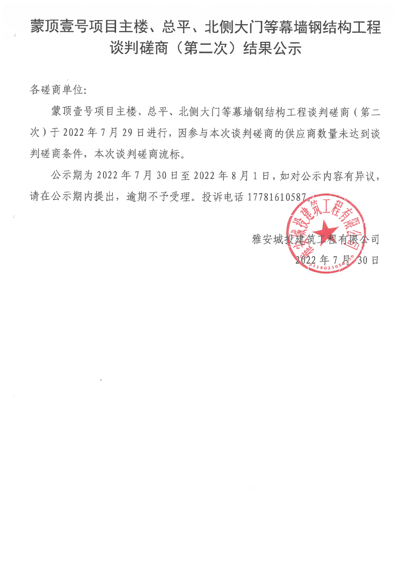蒙頂壹號項(xiàng)目主樓、總坪、北側(cè)大門等幕墻鋼結(jié)構(gòu)工程談判磋商(第二次)結(jié)果公示