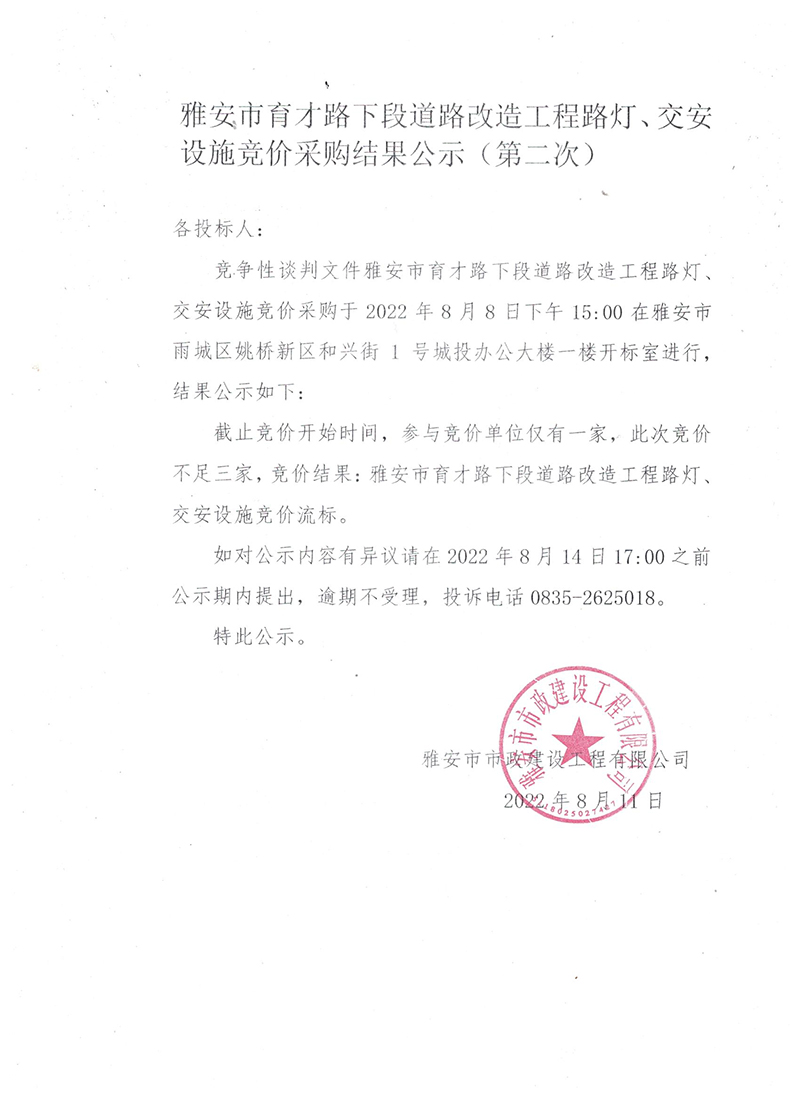 雅安市育才路下段道路改造工程路燈、交安設施競價采購結果公示(第二次)