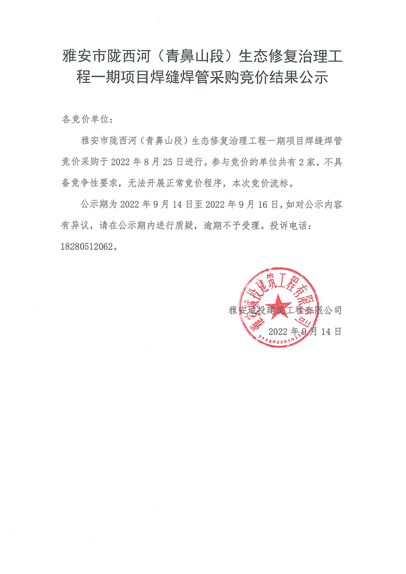 雅安市隴西河(青鼻山段)生態(tài)修復治理工程一期項目焊縫焊管采購競價結(jié)果公示