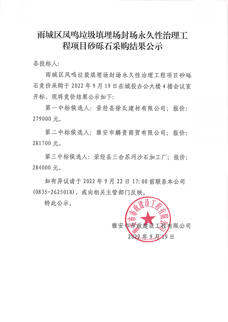 雨城區(qū)鳳鳴垃圾填埋場永久性封場治理工程項目砂礫石采購結(jié)果公示