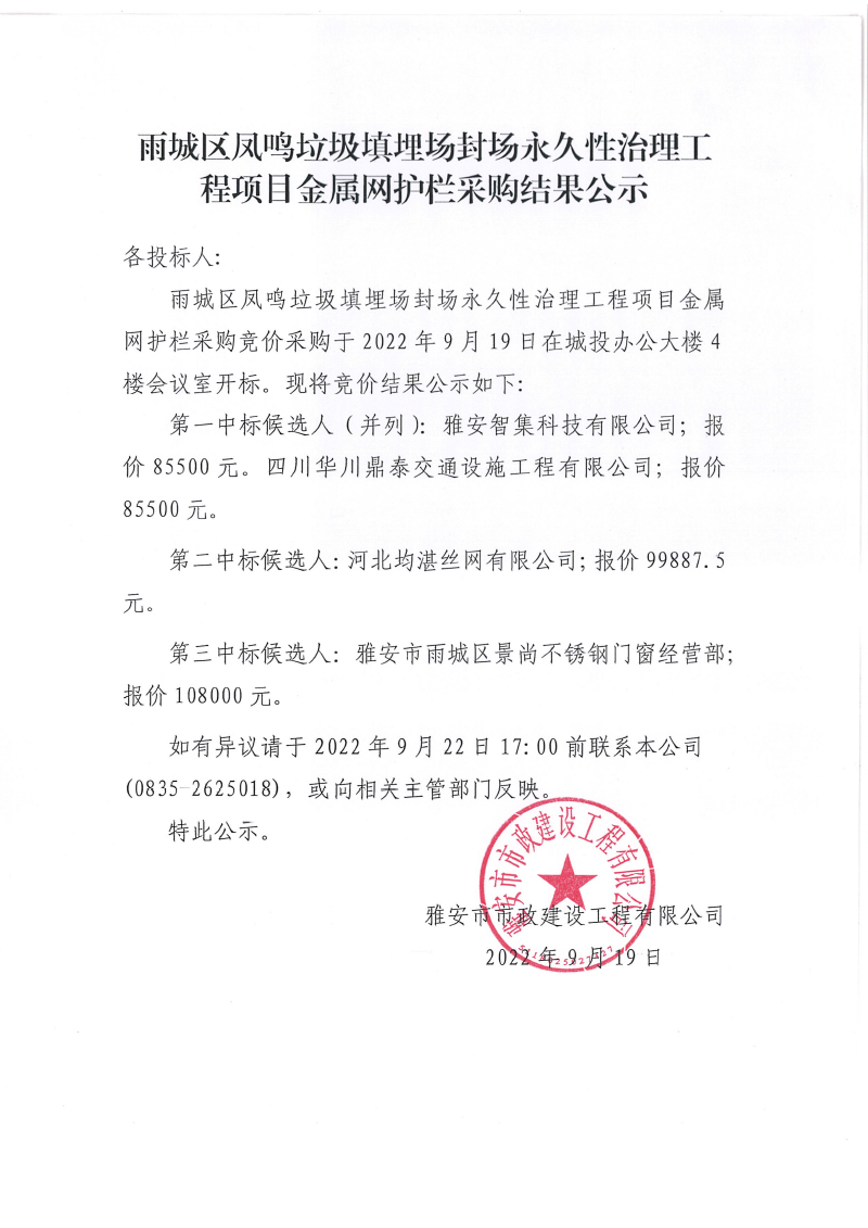 雨城區(qū)鳳鳴垃圾填埋場永久性封場治理工程項(xiàng)目金屬網(wǎng)護(hù)欄采購結(jié)果公示
